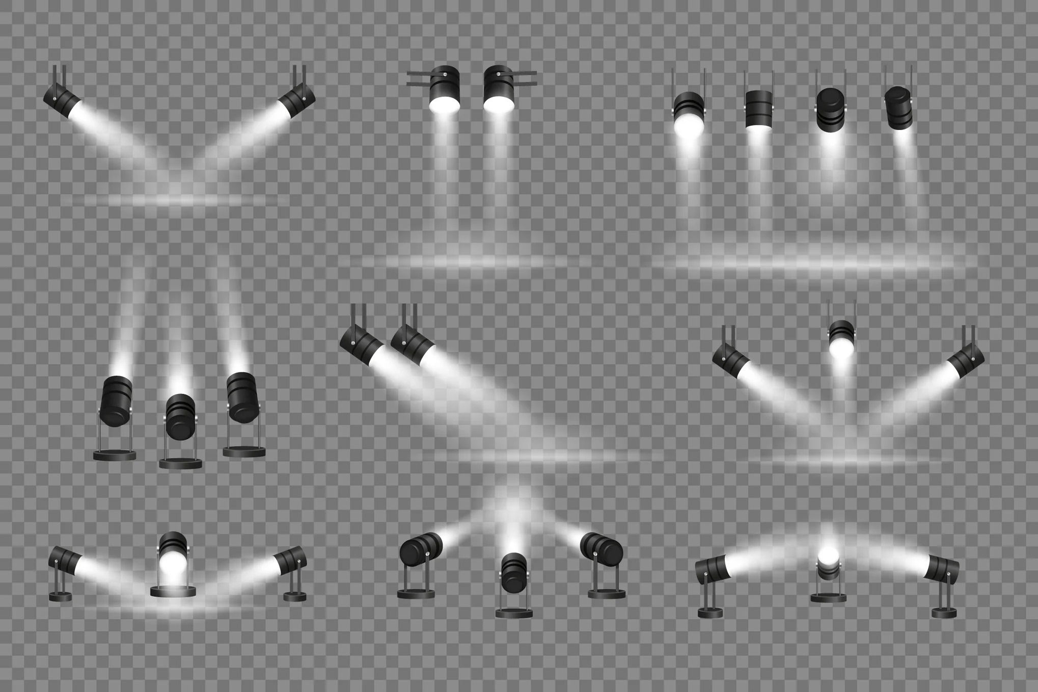 پروژکتور روشنکننده صحنه برای قرار دادن، نورافکنهای جدا شده با جهتدهی دقیق. نورهای واقعگرایانه و جدا شده به صورت وکتور برای فیلمها یا تئاترها، ارائه محصولات یا نمایشها برای تبلیغات.