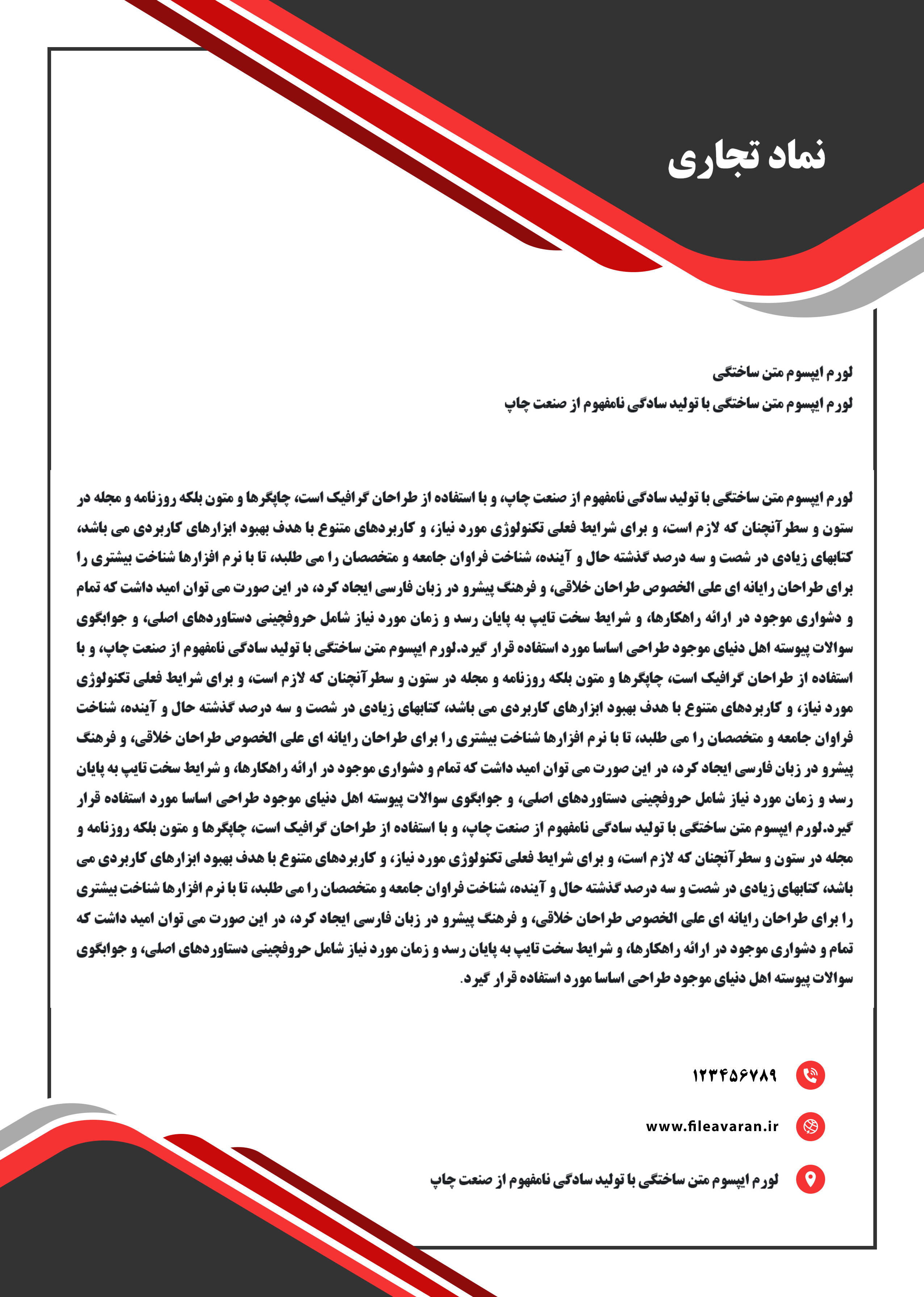 لایه باز سربرگ اداری سربرگ اداری خام شرکتی عبارت است از یک قالب چاپی یا الکترونیکی که برای نمایش اطلاعات شرکت در مکاتبات رسمی و اداری استفاده میشود. در طراحی سربرگ اداری خام، اطلاعات پایه شرکت مانند نام شرکت، لوگو، آدرس، شماره تلفن و فکس و نشانی وبسایت شرکت قرار داده میشود. قالب سربرگ اداری خام شرکتی معمولاً شامل اجزای زیر است: 1. لوگو: لوگوی شرکت یا نماد شرکت که هویت بصری شرکت را نشان میدهد. 2. نام شرکت: نام رسمی شرکت به همراه شرکت مادر (اگر وجود داشته باشد). 3. آدرس: آدرس دفتر مرکزی یا آدرسهای دیگر شرکت. 4. شماره تلفن و فکس: شماره تماس و فکس شرکت برای ارتباط با آن. 5. نشانی وبسایت: آدرس وبسایت شرکت برای ارجاع به اطلاعات بیشتر. 6. رنگها و طرحبندی: الگوی رنگی و طرحبندی منحصر به فرد که با شناسایی بصری شرکت سازگار است. معمولاً سربرگ اداری خام شرکتی به صورت یک فایل قابل ویرایش در نرمافزارهای مانند Microsoft Word، Adobe Photoshop و یا Adobe Illustrator تهیه میشود. این فایل قالب قابل ویرایش است، به طوری که میتوانید اطلاعات خود را در آن وارد کنید و سپس چاپ یا ارسال کنید.